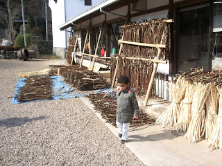 The outer layer of the wood is used to get the long wood fibers for washi, here being hung out to dry.