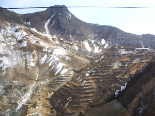 Then we transfer again to the Hakone ropeway to get which takes us up even higher over the hills and back down again to the spectacular view of the Owakudani sulphur springs...