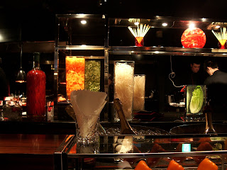 On the eve of Christmas eve we toddled down to the shiny lights of Roppongi [六本木] we headed towards the Mori Towers and then into L'atelier (L'Atelier de Joel Robuchon), a two Michelin star restaurant. It had a great atmosphere, the Japanese waiters all spoke French (and some English) and were not intimidating at all, being very friendly and attentive. The decor was a cool black and red, with various bottles and jars full with food for colour.