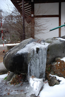 We then went back to the ryokan when it started getting dark (not before a little snowball fight...) and had our 'traditional' Japanese dinner. In the general tradition of Japanese dinners at ryokans, it was very colourful. We had soy milk based nabe [鍋], which had some tofu making syrup to pour into the nabe pot afterwards to make the remaining soy milk [豆乳] into soft tofu. there was also ikura [いくら] (salmon roe) in a very small cocktail-looking shot glass, the standard rice, fish, sashimi, some unidentifiable green cuboidal substance (which didn't taste of much except the soy sauce that I put on), some fish-cake...and other needlessly colourful foods... Basically, there were lots of small plate of things, which didn't look like it would fill you up, all beautifully arranged which was very hard to finish, because we were very full when we were only about half-way though...