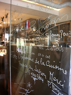 I had a very nice foie gras fish terrine (very nice foie gras!) and Greg went for a form of black pudding (which looked more like a chocolate brownie. I have to say I prefered the look of mine, the idea of a slab of blood didn't really appeal. on the other hand the slab of blood didn't look or taste anything like what I expected and it had a surprisingly soft texture. Moving on, we both took the hot and cold veges which arrived on a square plate neatly laid out in a grid. There each of the 30 or so little veges were all different, and we spent most of the time working out what they were before eliminating them one by one. For the main course I took white fish in a tomato soup which came with a prawn sitting on a bed of finely diced vegetables. Dessert, which is usually the most difficult to avoid dairy products, they offered me several non-cow related options involving fruit and sugar. I took the cherries, which then reappeared in a very tasty red wine sauce. In addition to the tastiness, the sauce also tried to make me more drunk.