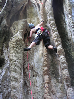 Originally the climb is meant to be started by climbing 'tarzan' which is not even rock, but a large and very cool tree which seems to be growing tendrils. however, as we were making our way to start the climb we were stopped (very politely) by a guy called Bob, who tolds us how the tree was actually worshiped by the buddists and requested that we use the ladder instead. And, yes, there was a ladder. Apparently from the weddings which take place hanging from the rocks over Tonsai beach.