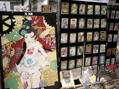 We walked into 'West 3' and it was rather dark. the other half of the hall was properly lit, I guess this side was in darkness to allow people to see the video projection which was aimed at one of the walls. Ignoring this there was some great art work hiding in the dark...Unfortunately, the DARK meant we couldn't get a good photo of this stall, but this lady (Monchi Hoshi) - who can be found here...and her shop here...- had amazing artwork, a kind of meld of the the bold and crisp forms of art deco and the oriental. Original designs seemed to be printed on cloth for hanging and smaller items, like bags. She also had a couple of beautifully etched and stained mirrors on show.