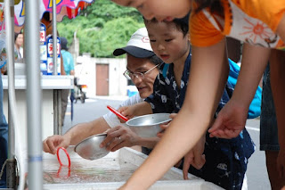 Trying your luck with a paper paddle to catch little gold fish was very popular. 200yen for children, 300yen for adults and 500yen for a slightly different scoop to try and catch little turtles. Both the scoop and fish catching paddle were made of water soluble stuff to impede the amount of catching actually done. So it was quite a challenge added to the fact that the fish were fully aware of the whole catching situation. There were many different kinds of gold fish, fantails, telescope eyed ones, black ones, patchy coloured ones as well as small turtles a little catfish, shrimps and a miniature lobster.