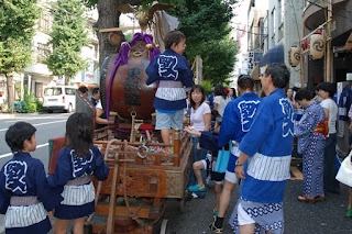 They all seemed to be preparing as opposed to actually performing. The kids were in their own little matsuri outfits, with some perched on the taiko kart randomly hitting the drum. Some of the older guys were trying to teach the kids the beat that they should be following, but it's far more fun just to whack the thing...so that's what ended up happening.