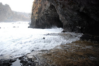 But on the brightside we did see a glimpse of the Japan Sea. The Japan Sea was enjoying the wind and crashing happily about on the coast. We did at one point venture out of the warmth and protection of the car to have a little walk, battling against the strong winds to have a look at Ganmon [巌門]. We walked down to the edge of the sea, then went down some stairs that we installed in a tunnel the the mass of rock that formed part of the coast line. It was dark. We came out at the edge of a sea-eroded arch. However, the sea was rapidly and rather energetically approching the rock that we standing on. And as all the signs painted on the wall of the cave-like place that we were currently standing in were all pointing in the direction from which we had just came and said 'EXIT' we thought we'd better leave before the sea decided to take us with it.